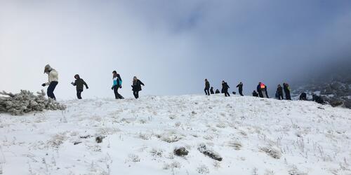 Bei Schneegestöber, Sonnenschein und sternenklarer Nacht fand der Unterricht auch immer wieder draußen statt und bekam dadurch eine ganz besondere Qualität, die auf vielfältige Weise in den weiteren Unterrichtsprozess einfloss. (Ganz nebenbei wurde beim täglichen Wandern, Rodeln und Bauen von Schneekunstwerken in der verschneiten Landschaft so viel und intensiv Sport (und Kunst) gemacht, wie an sonst kaum einem anderen Schultag!)