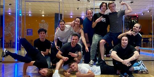 In einer ähnlichen Situation befanden sich die Schülerinnen und Schüler der Abi- sowie der Mittleren Reife-Klasse zusammen mit drei Lehrkräften in der Tanzschule "Herrmanns Tanzpalast" in Rosenheim, wo die beiden Klassen beschlossen hatten, gemeinsam an einem Hip-Hop-Tanzkurs teilzunehmen. Organisiert hatte dies dankenswerterweise Alina Menne aus der Abi-Klasse.