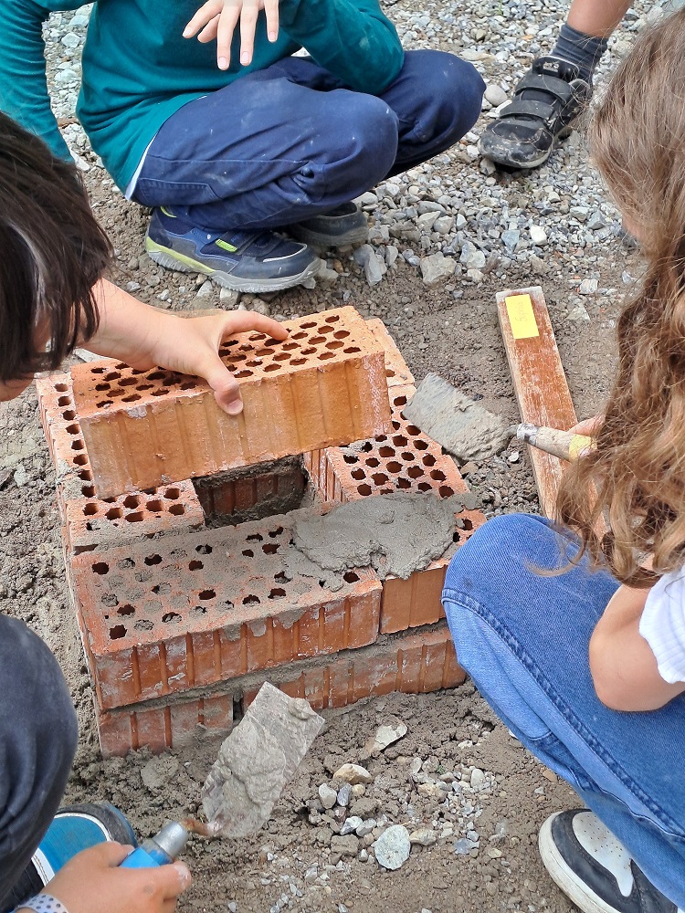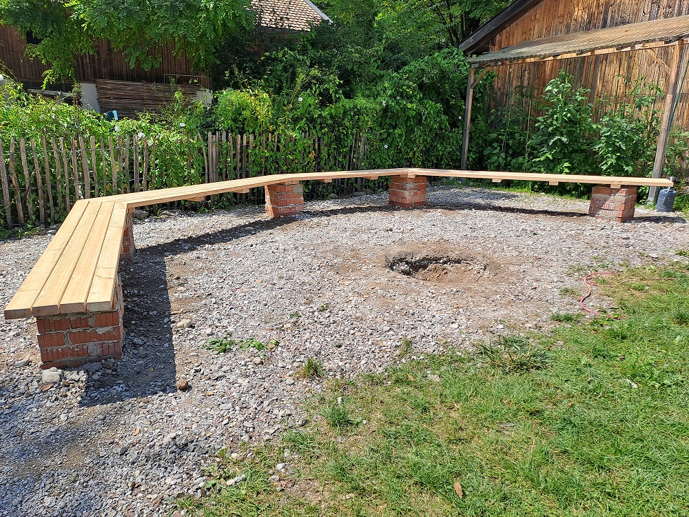 Immer wieder trafen sich die Schülerinnen und Schüler, um gemeinsam Gruben auszuheben, Beton anzumischen und Mauern zu errichten. Dann wurde das Holz exakt auf die richtige Länge gesägt und verschraubt. Schließlich verbanden die Kinder die Sitzfläche mit der Wand, so dass eine stabile und schöne Bank entstand. Die Kinder können zu Recht stolz auf ihr Werk sein!