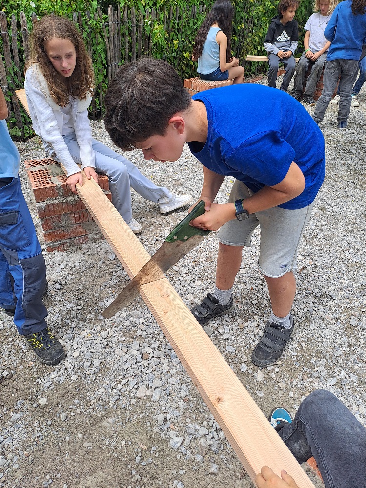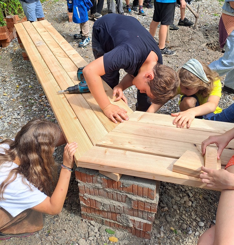 Mit viel Engagement und handwerklichem Geschick entstand im Rahmen der Bauepoche der 3. Klasse eine neue Sitzbank für unseren Schulgarten.
