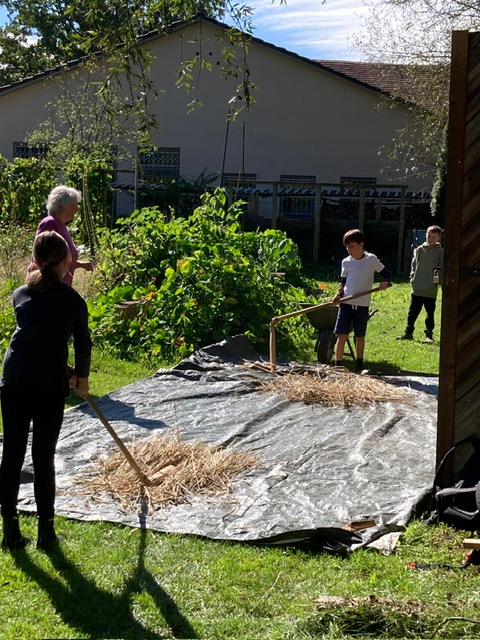 Im Schulgarten ist Erntezeit – die Kinder erleben hautnah den Jahreskreis. Jetzt wird das Getreide eingebracht und auf traditionelle Weise gedroschen. Mit viel Freude und Einsatz erfahren die Schülerinnen und Schüler, wie aus den goldenen Halmen Körner gewonnen werden. So verbindet sich die Arbeit mit der Natur mit einem lebendigen Lernen, das Kopf, Herz und Hand gleichermaßen anspricht.