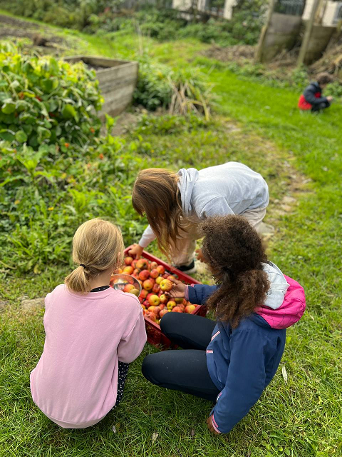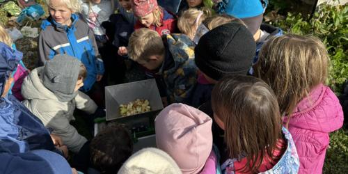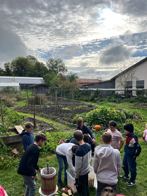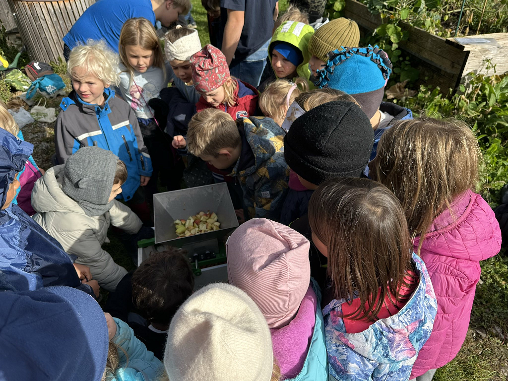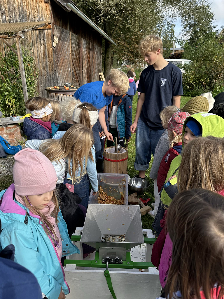 Zufällig kam an diesem wunderschönen Sonnen-Mittwoch die 1. Klasse vorbei und durfte gleich alles begutachten – und natürlich den leckeren Apfelsaft probieren.